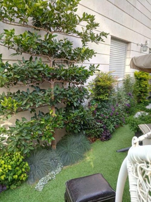 בתמונה למעלה עצי לימון מעוצבים בסגנון 'אספלייר'- 'שטוח' ומשמשים כגדר חיה גבוהה –העצים מורכבים ומעוצבים ונתמכים במשך שנים על רשתות ועמודים (משתלת בילו במבוק)