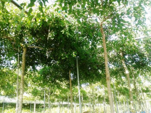 בתמונה מעלה מימין: עצים המעוצבים כ'שמשיה' או 'מטריה' (משתלת בילו במבוק) ניתן לצרף כמה עצים יחדיו לפרגולה טבעית המייצרת צל בחודשים החמים של השנה.