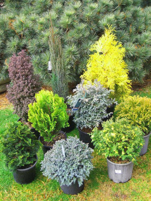קומפוזיציה של ערערים ומחטניים בשלל צבעים, צורות וגדלים