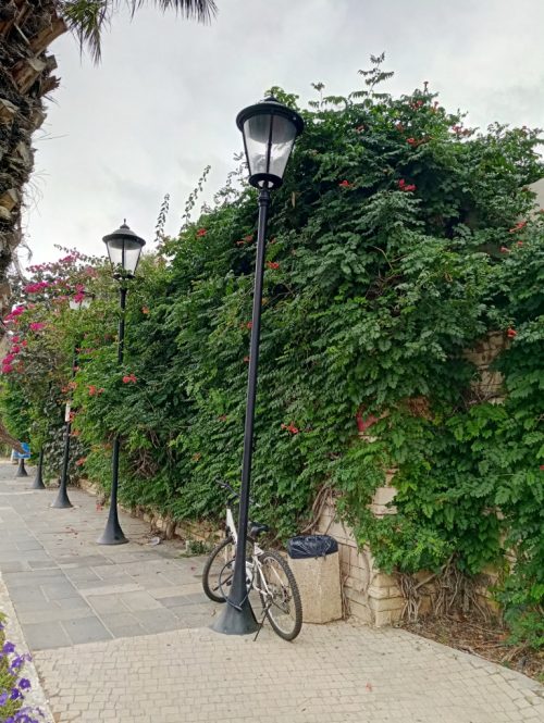 אריחי בטון אדריכלי מוקפים בסיגלית אוסטרלית בגינה בחודש מאי בכפר סבא