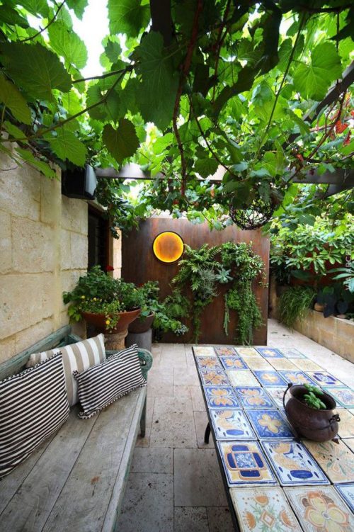 גינות מגוננות, הצללה בשילוב צמחיה, קלאסי, שערים וקשתות, חצץ,טוף ,חלוקי נחל ושבבי עץ