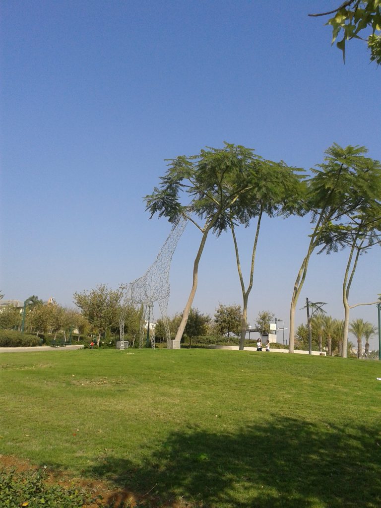 פסל גירפה בגודל מלא (אחת מתוך שלוש) זוללת עלים מעצים - פארק כפר סבא בתכנון משרד אדריכלי הנוף צור וולף