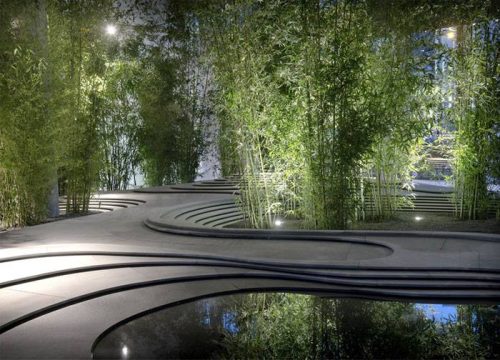 האדריכל קנגו קומה מציג את הפרשנות שלו לגינת זן יפנית בסביבה אורבנית בתערוכה במילנו. טופוגרפיה מעשה ידי אומן מרוצפת אבן היוצרת גומות אשר חלקן משמשות כבריכות השתקפות ובחלקן נשתלו צמחי במבוק וחלוקי נחל.