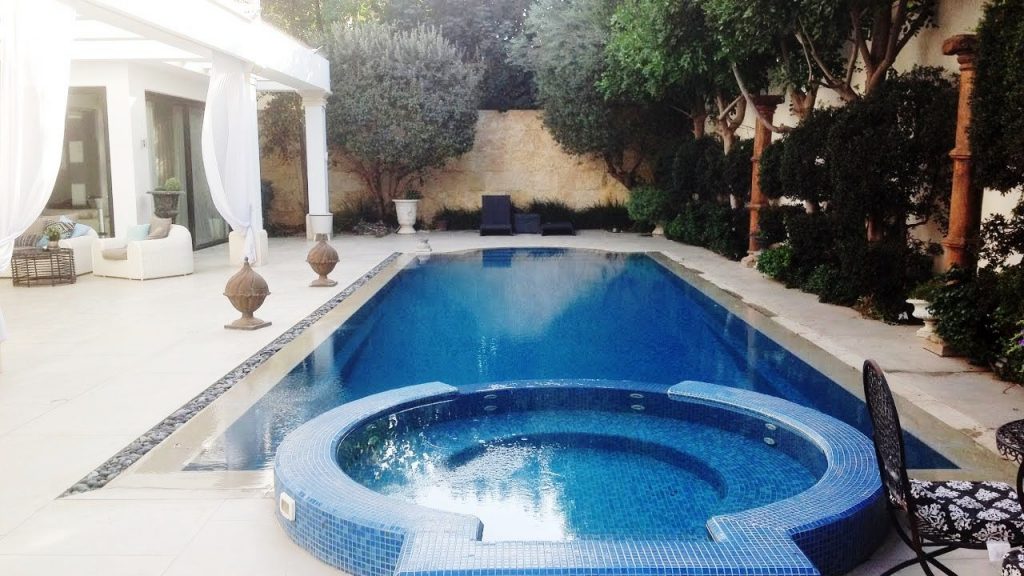 בריכת שחיה וספא, גינות אורבניות, מנוחה שיזוף, ערוגות סוקולנטים וקקטוסים, מודרני, גינה חסכנית במים