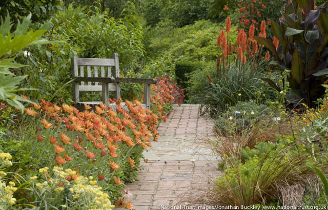 Bench and path in the Cottage Garden with Arctotis x hybrida "Flame" at Sissinghurst Castle Garden, near Cranbrook, Kent.