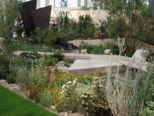 זןכת מדלית זהב של גינות ראווה בתערוכת הגינון בצ'לסי אנגליה. The Telegraph Garden . גינה ים תיכונית עם דמוי הרים ושינויים גאולוגיים.