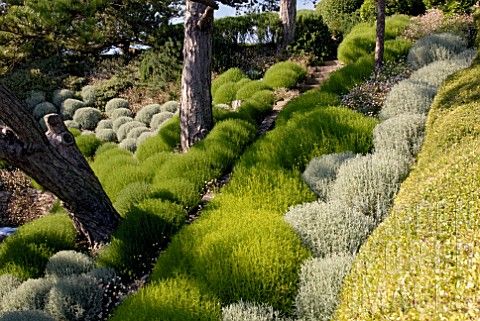 לשמש מלאה Santolina between the Heath Garden and the Croquet Lawn at Nymans, West Sussex, in June.