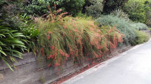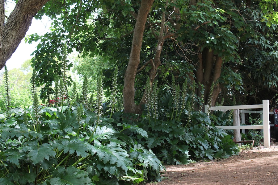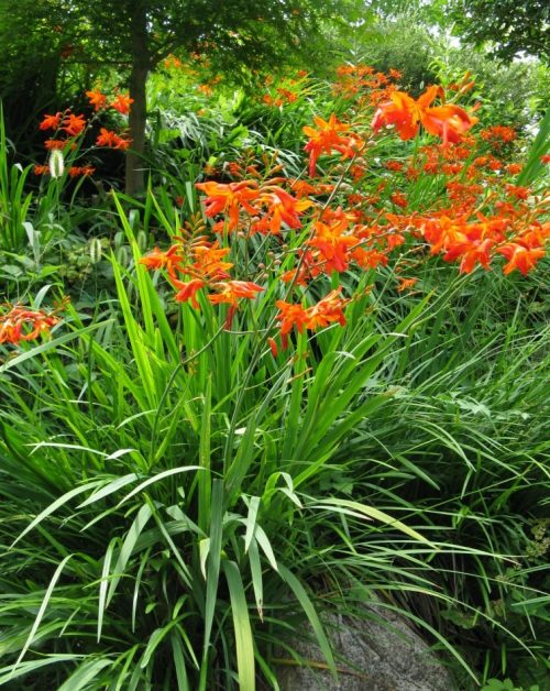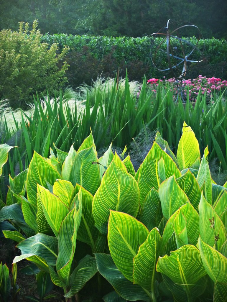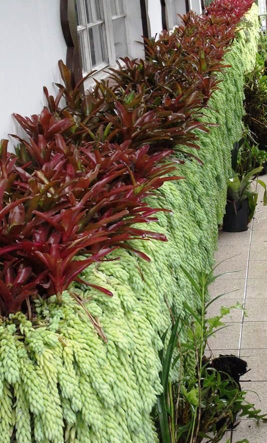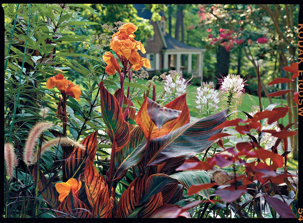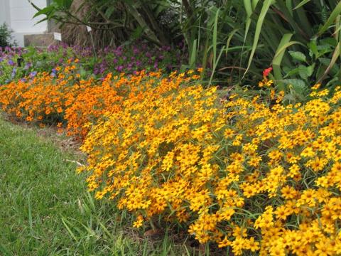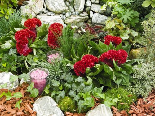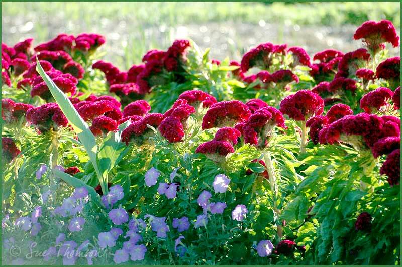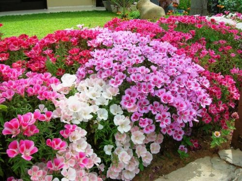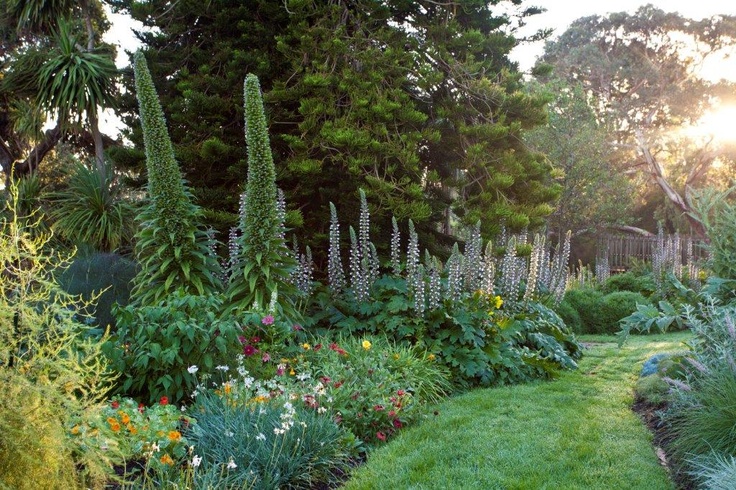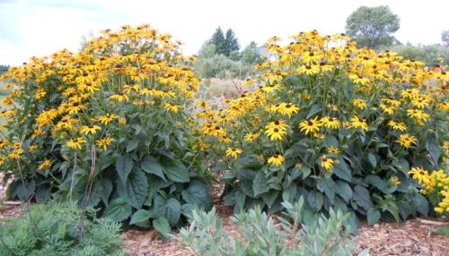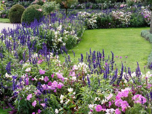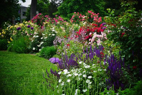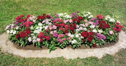 back garden planted with victoria blue salvia profusion white and cherry zinnia missouri primrose and autumn joy sedum