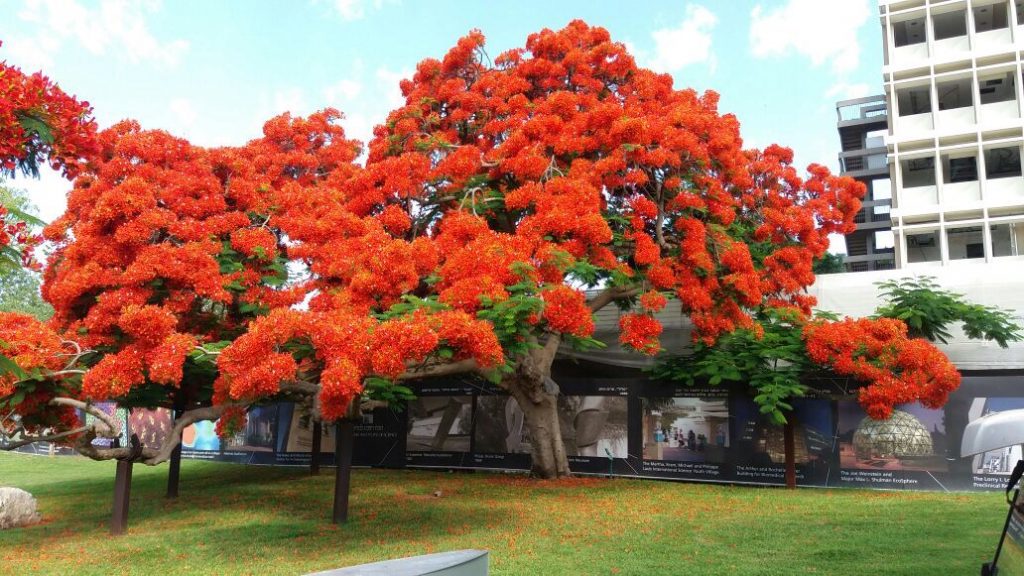 הצאלון המפואר במכון וייצמן שענפיו זקוקים לתמיכה. בפריחה קייצית מלאה.