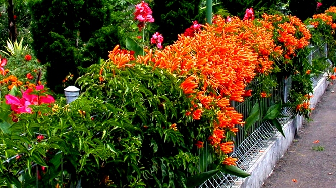 מטפס ירוק עד,בעל עלים מנוצים בצבע ירוק כהה מבריקים ויפים. בעלת פריחה כתומה מרשימה מאוד וארוכה מאוד בחודשי החורף (כ4 חודשים בחורף ולעיתים גם בקיץ), הפריחה מכסה את כל הצמח ואז הגדר נראית כקיר כתום. מתאים כמטפס משתלשל שאינו תופס נפח גדול. מצוין כגדר חיה נוחה לטיפול לאורך זמן. אוהב שמש מלאה ואוהב יותר את האזורים החמים של הארץ עלול לסבול בקור.