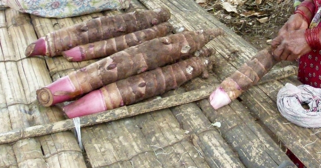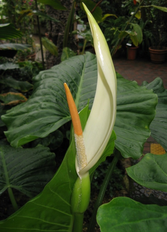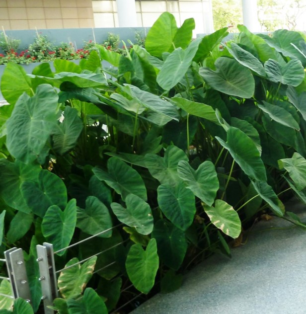 עשבוני גדול מאד בעל קנה שורש הנעלם בחורף וחוזר באביב. בעל עלים ענקיים המזכירים אוזני פיל. קיים זן עם עלים ירוקים וזן עם עלים סגולים ארגמניים. פריחה ופרי אינם משמעותיים בארץ. צמח לחצי צל וצל מלא. יכול לשמש כצמח בית בתנאי התאורה הטובים ביותר בבית. זקוק להשקיה גדושה ומתאים לכל הארץ. באזורים הקרים יעלם מוקדם בתחילת החורף וברוב המקומות ילבלב שוב באביב. זקוק למקומות מוגנים וללא קרה.