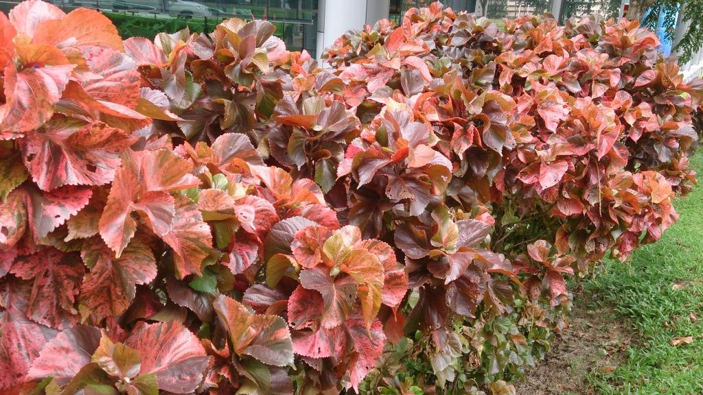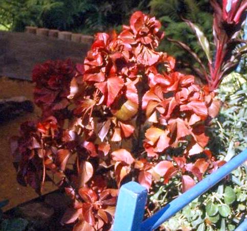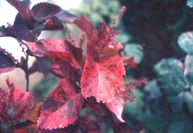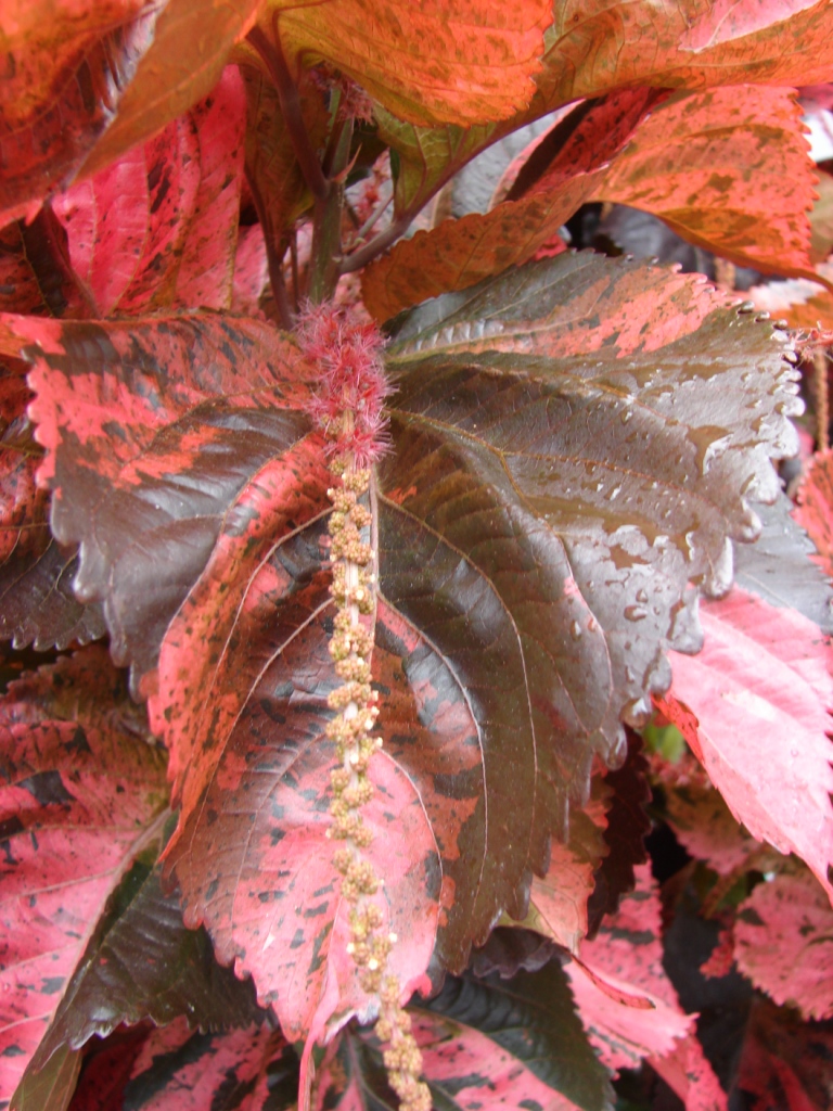 שיח נשיר מותנה אשר סובל מאד מקור וקרה . אם יש שלכת היא חורפית. שיח רחב וענף בסביבות 3 מ' גובה. בעל עלווה מגוונת בירוק ואדום עם דוגמת שיש של כתמים ונקודות וצבעי אדום חזקים ביותר. העלים גדולים ורכים ביצתיים עם שפה משוננת. הפריחה חלה בקיץ ונראית  כחוטים דקים אדומים המשתלשלים כלפי מטה. אינה קישוטית במיוחד מכיוון שנבלעת בצבעי העלים החזקים. צמח טרופי הסובל מקור וזקוק להשקיה סדירה ורבה והגנה מרוחות וקור. מאד בולט בגינה בצבעיו ויכול לשמש כגדר חיה . סובל יותר מקור מהזן מלול איטי יותר וצריך שמש מלאה.