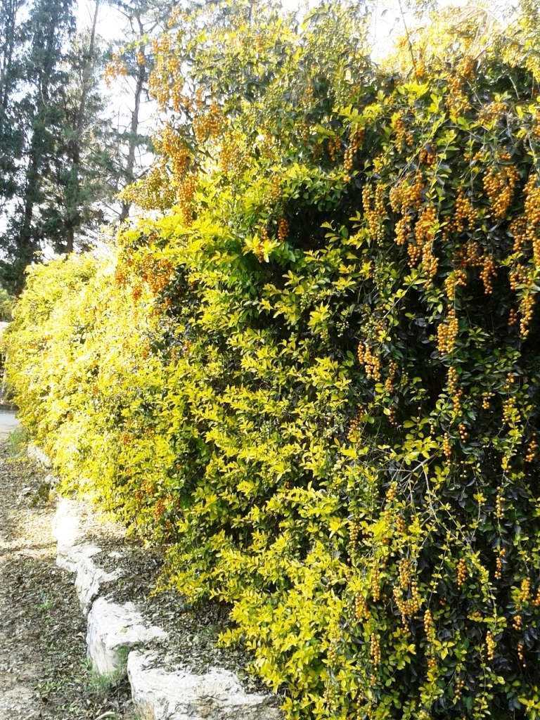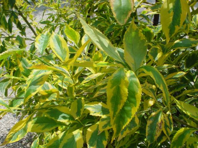 שיח נשיר מותנה גדול בעל ענפים קשתיים ארוכים. אפשר לעצבו כעץ קטן ואז יכול להגיע גם ל 8 מ' גובה. עלים רכים גדולים יחסית בירוק עם שוליים צהובים בולטים. משוננים קצת. הפריחה בסגול באשכולות שמוטים כלפי מטה כמעט כל השנה. בסוף הקיץ ובסתיו מופיעים אשכולות של בתי גלעין עגולים כתומים קישוטיים ביותר. צמח רגיש מאד לקור וקרה. מצוין כעץ קטן וכן כגדר חיה פורמלית או חופשית. העלים בעלי מסגרת צהובה יפה. קוצני יותר מהזנים האחרים. לשמש מלאה וחצי צל. זקוק להשקיה סדירה.