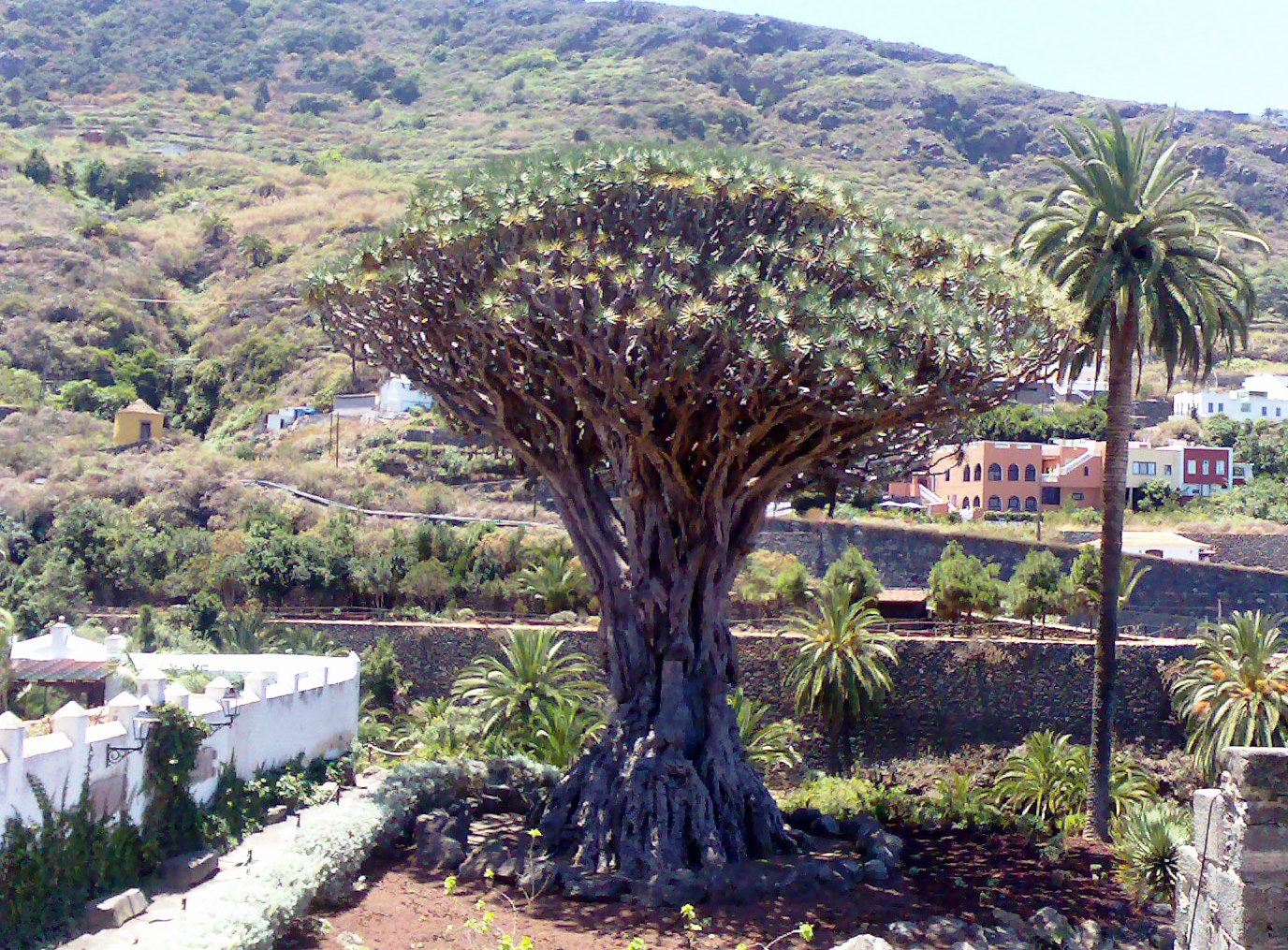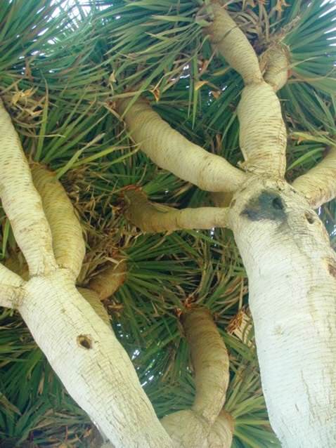 עץ קטן דמוי דקל, גזע סוקולנטי בשרני, ממנו צומחים בגובה נמוך מספר ענפים בשרניים כמו אצבעות עבות. הגזעים מתפצלים כולם יחד בגובה אחיד מה שמקנה לעץ ברבות הימים צורת פיטריה יפה עם סידור ענפים מעניין בתחתית הצמרת. הגזעים נשארים עם צלקות טבעתיות כשהעלים נושרים. בקצה כל ענף צומחת שושנת עלים דמויי חרבות בצבע ירוק אפור. נוף צפוף, מעוגל ודרקוני. פריחה בקיץ במופע של שיבולים לבנות גדולות .בסוף הסתיו-אשכולות ענבות ירוק כתום. הפריחה והפרי נראים אך לא מאד קישוטיים. צמח עמיד ליובש וחזק אינו מפונק. צומח מאד מאד לאט ולכן מופע העץ מגיע רק אחרי שנים רבות מאד.
