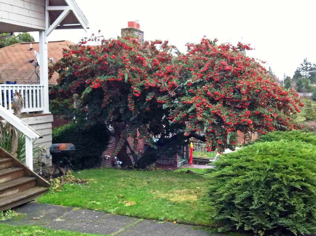 אשכולות בולטים וגדולים של פרי אדום ופריחה לבנה, שיח גבוה כ 2-4 מ'