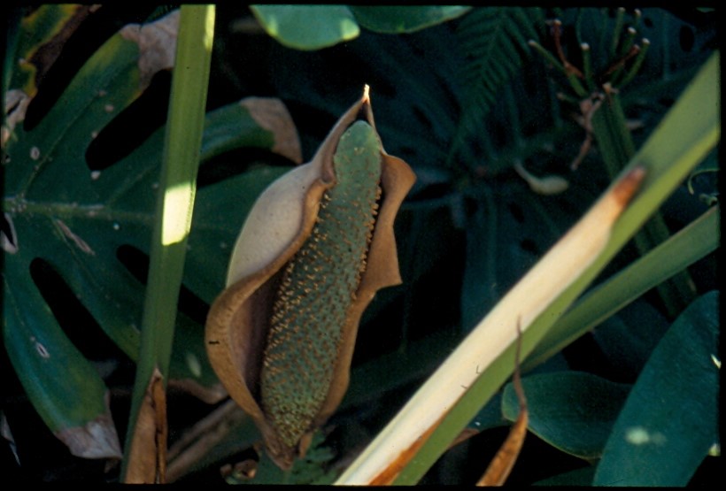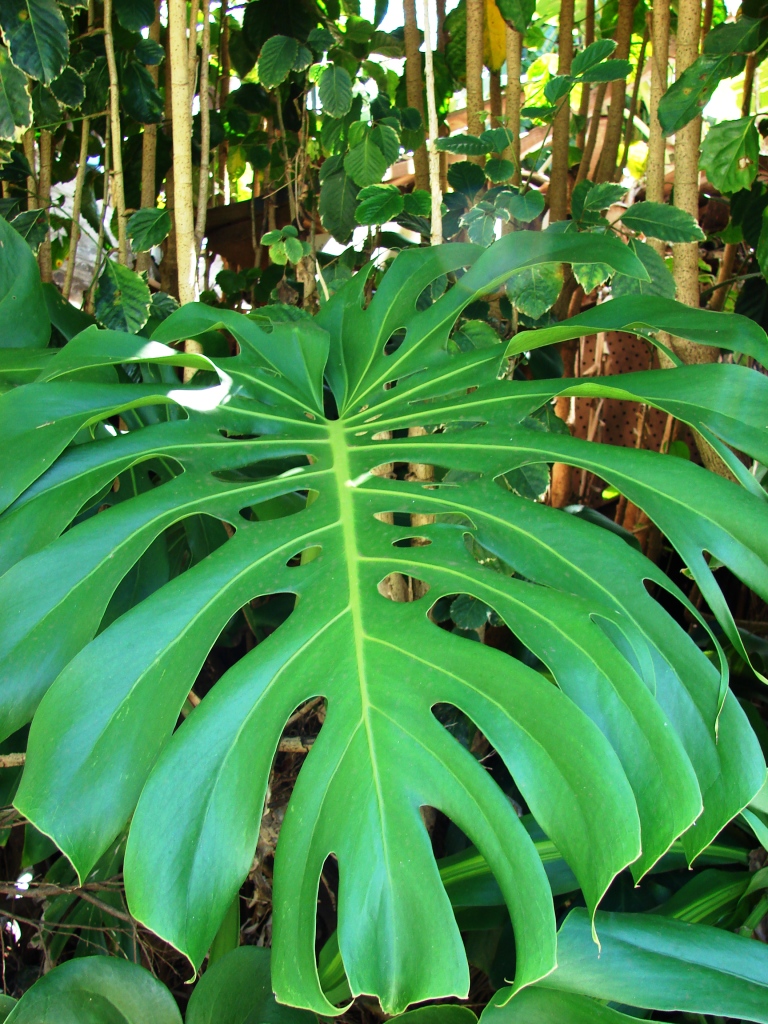 מטפס עשבוני ירוק עד המשמש כצמח בית וגינה בצל מוחלט ובמקום מוגן. בעל שורשי אוויר וגבעול עקום מצולק. בעל עלי ענק מפורצים גזורים ובעלי חורים עגולים בשטח פני העלה. עלים מבריקים ירוקים כהים. הפריחה אינה משמעותית. צורתה כצורת פרחי הלוף. הפרי הבשל אכיל וטעים בעל טעם טרופי. הפריחה והפרי נדירים רק לאחר זמן רב של צמיחה. בעל נוכחות טרופית מאד. זקוק להשקיה סדירה ורבה. מתאים כצמח בית בכל רחבי הארץ ובגינה רק במקומות החמים ונעימים ללא ארועי קרה. אם יטפס על משטח מחוספס ויקבל הרבה מים גם דרך שורשי האויר שלו יפתח עלים גדולים במיוחד.
