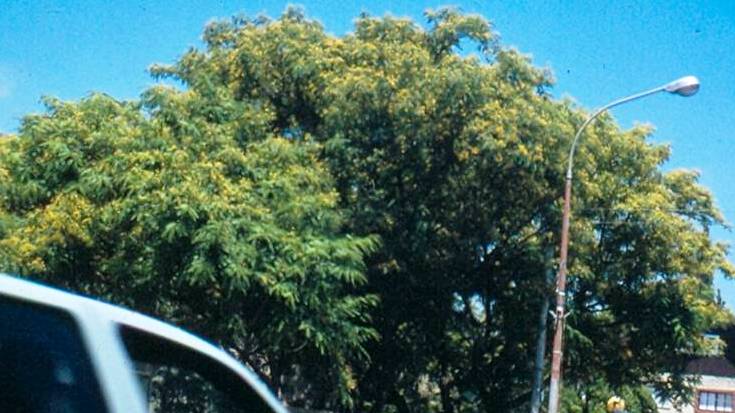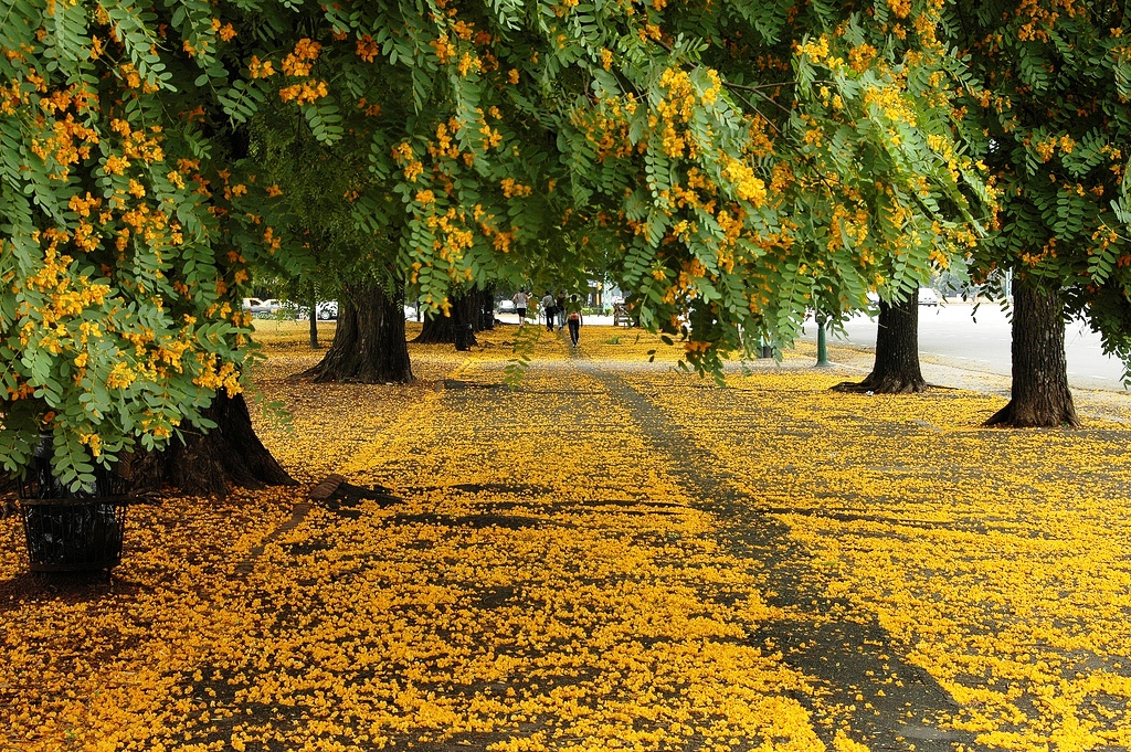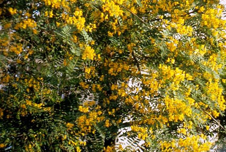 עץ צל גבוה ורחב לגינון ציבורי,פריחה צהובה ממושכת היוצרת שטיח צהוב, גזע קישוטי