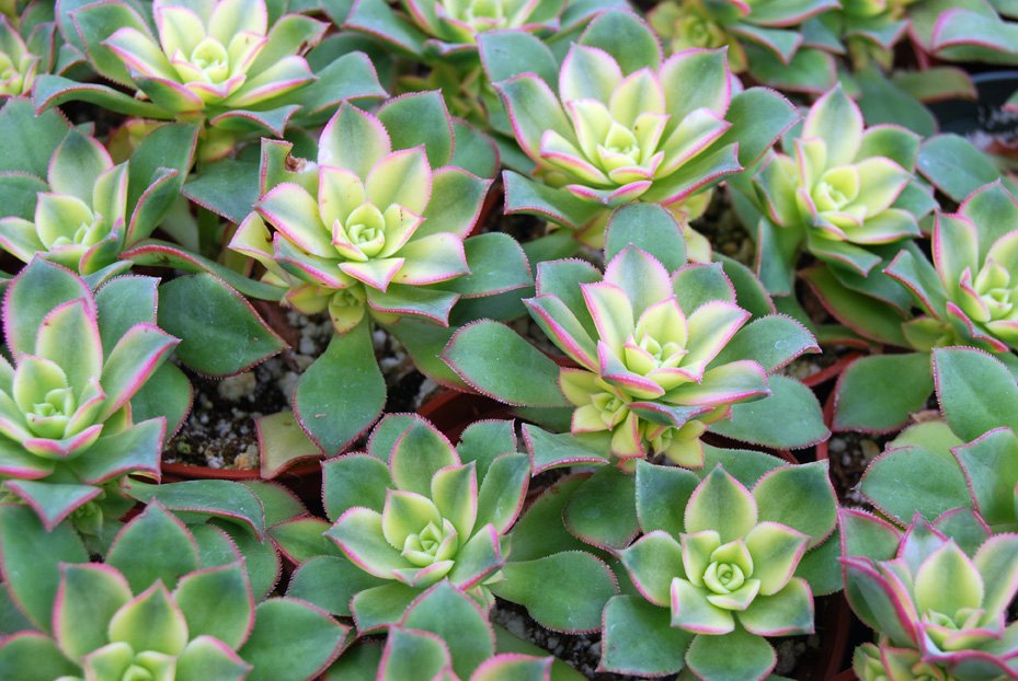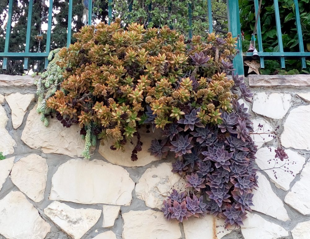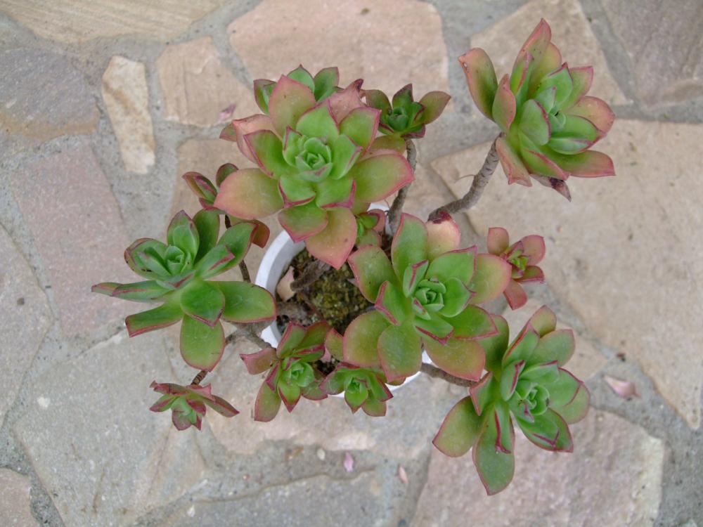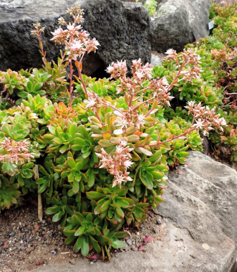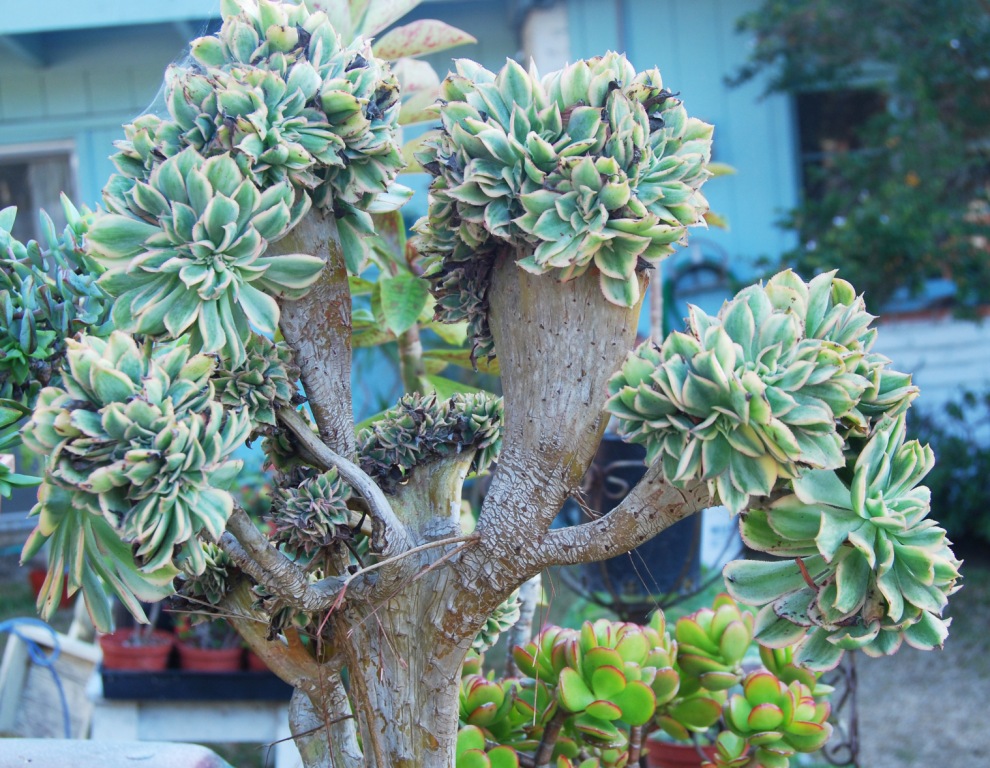 שיח סוקולנטי ירוק עד. שיח קומפקטי עם הרבה ענפים. כל ענף מסתיים בשושנת עלים היוצרים צורה של פרח. כל השיח ניראה כאוסף של פרחים. זה מקור יופיו. הפריחה בתחילת הקיץ כחודש חודשיים בצבע לבן עם עורקים אדמדמים. עולה על עמודים גבוהים מעל הצמח. נחמדה אך אפשר בלעדיה. צמח חזק ועמיד לשמש מלאה וחצי צל. עמיד ליובש. מתאים לכל אזורי הארץ.