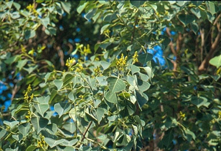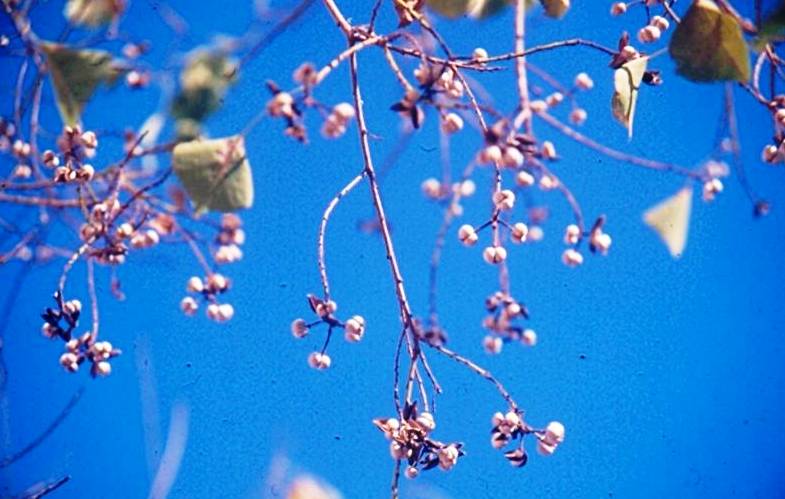 עץ נשיר, בגודל בינוני, חסון. גזע זקוף וצמרת עגולה ואוורירית. ייחודו בצבעי השלכת היפים שלו :כתום ,אדום,ורוד,סגול וצהוב. ישנם עצים מורכבים שצבע שלכתם אדום ואחיד.בשל שונות בצבעי השלכת של העצים מומלץ לקנות את העץ בסתיו על מנת לחזות בדיוק מה צבע השלכת שלו. הפרי הוא הלקט המצופה שעווה לבנה, בקצות הענפים, נראה כמו פופקורן ומכיל את הזרעים . מכאן שמו העממי "עץ הפופקורן". הפרי רעיל, נשאר על ענפי העץ גם לאחר השלכת. מראה העץ הערום בחורף יפה. העלים בצבע ירוק בהיר דמויי לב יוצרים נוף אוורירי . לפריחה אין חשיבות גננית- שיבולים שמוטות בגודל בינוני בצבע קרם צהבהב. מתאים כעץ רחוב, צל, לגינות קטנות. מתקרח עם השנים ונהיה דליל יותר. מתאים לכל אזורי הארץ חוץ ממקעה וערבה. באדמות דלות זקוק להשקיה סדירה. רגיש לחוסר ניקוז בקרקע. עם השנים נהיה קצת דליל.