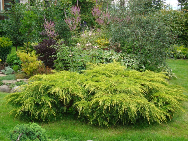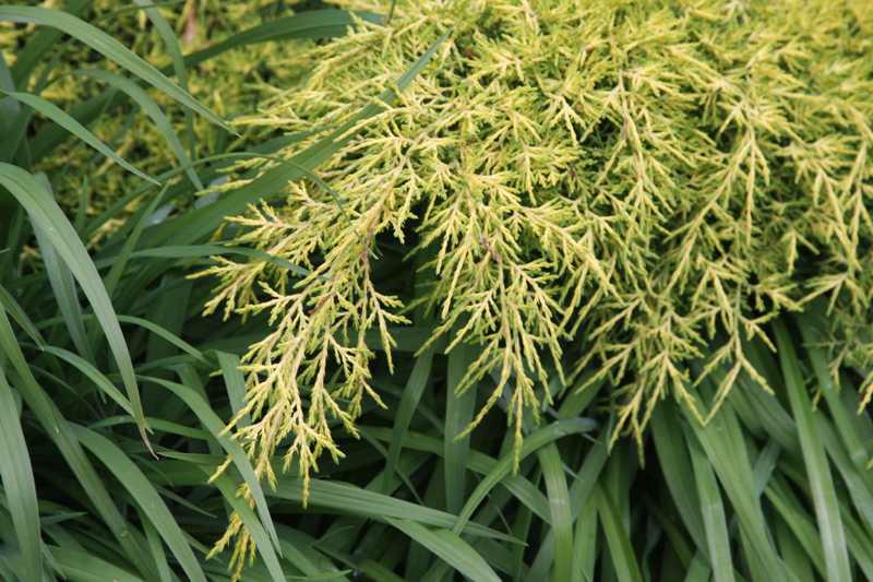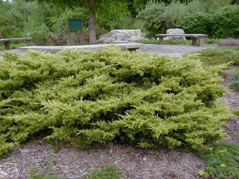 שיח מחטני נמוך וקומפקטי. הענפים אופקיים ושמוטים בקצות הענפים. העלים בצבע ירוק עם לבלוב בצבע צהוב לימון