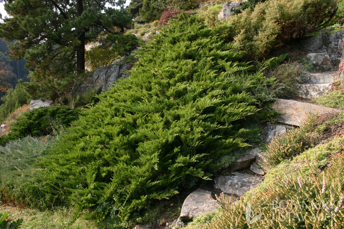 מחטני ירוק עד . משתרע  זוחל. העלים קשקשיים  בצבע ירוק. הפריחה  אינה משמעותית. הפרי אצטרובל קטן כחלחל קישוטי.  צמח כסוי .  צומח לאט וצריך  סבלנות. עמיד לקור ומעדיף את המקומות הקרירים של הארץ.