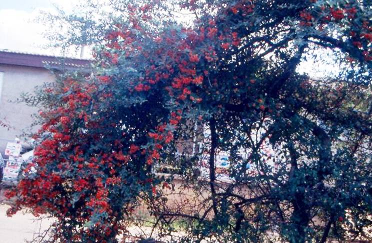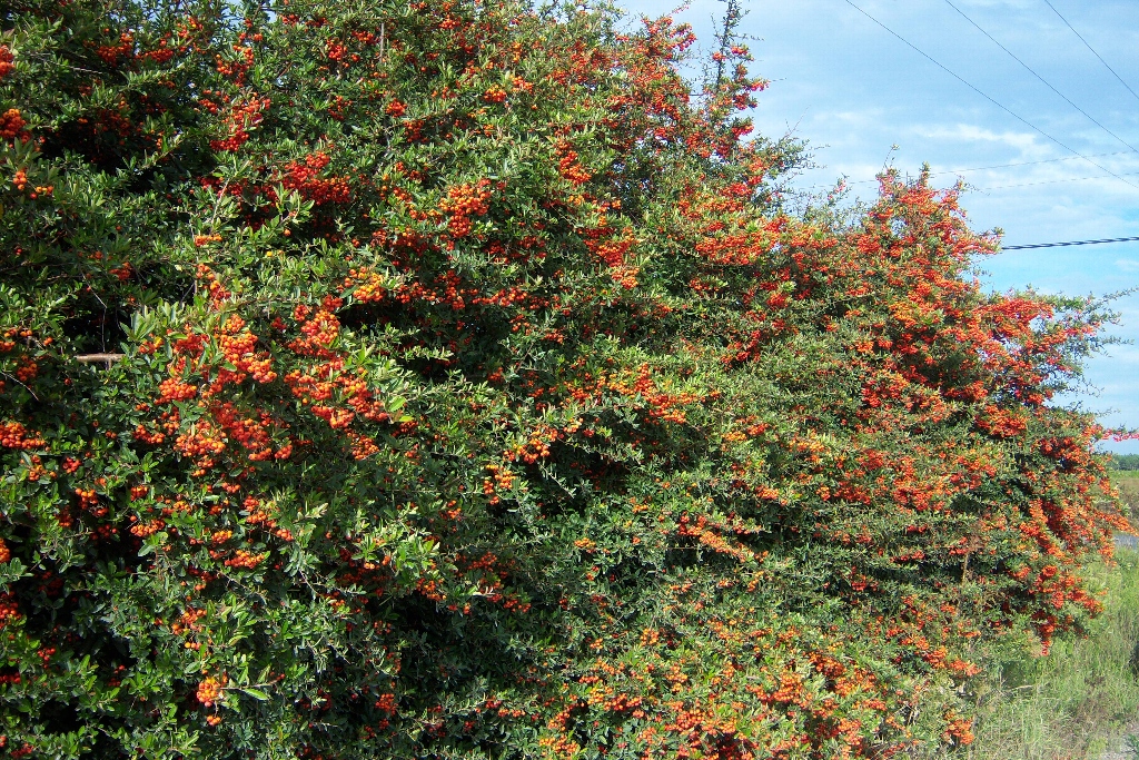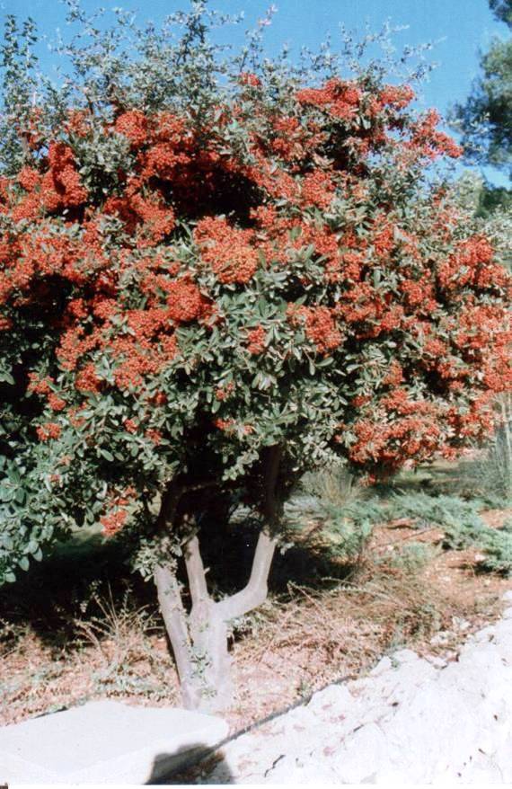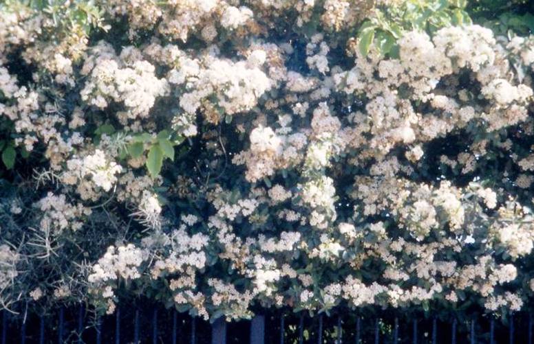 שיח ירוק עד רחב וגדול בעל ענפים שמוטים מעוצים. שיח פרוע מאד . בקצוות הענפים יש קוצים. העלים איזמליים קטנים בצבע ירוק כהה מבריקים. הפריחה במשך כשלושה שבועות באביב ביעילות גבוהה מאד בצבע לבן. ממש מכסה את כל הצמח. בסתיו מבשילים פירות אדומים. ענבות עגולות יפות המכסות את הצמח במשך כל החורף. מאד קישוטי. צמח חזק המתאים מאד לאזורים הקרירים יכול גם להשתפל מעבר קיר ואפשר לעצבו כעץ קטן . לשמש מלאה. עמיד מאד ליובש.