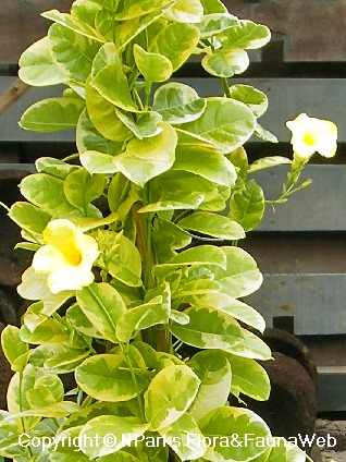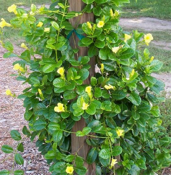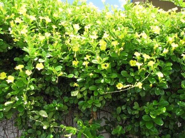 מטפס לא מעוצה, ירוק עד צומח מהר אך אינו שתלטן וקל לעיצוב והכוונה.נכרך וצריך חוטים לטפס עליהם.  פורח בצהוב זוהר בפרחים גדולים בשפע תקופה ארוכה של אביב וקיץ. העלים מבריקים בצבע ירוק יפים גם הם. מתאים לכל הארץ חוץ מאזורי ההר בשל רגישות לקור וקרה. מתאים גם לקו שלישי של חוף ים. זקוק לחצי יום שמש ישירה ולהשקיה סדירה. באזור השפלה מתאושש גם אחרי חורף קשה. שימו לב – ישנו בילבול בין האלמנדה הצהובה לפנטלינון צהוב – האלמנדה הינה נשירה מותנית והפנטלינון ירוק עד.