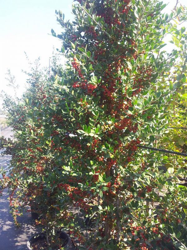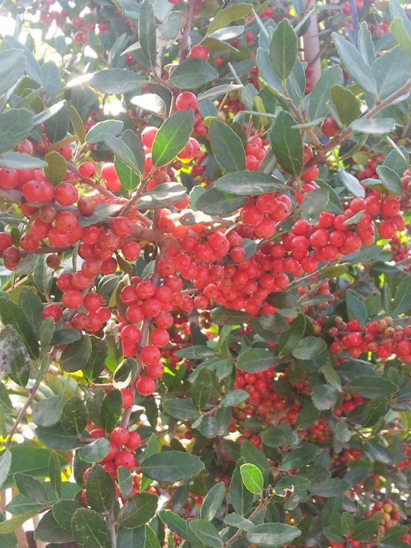 השיח הענק מכוסה פרות אדומים ויפים מנובמבר עד סוף החורף
