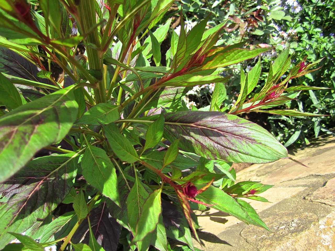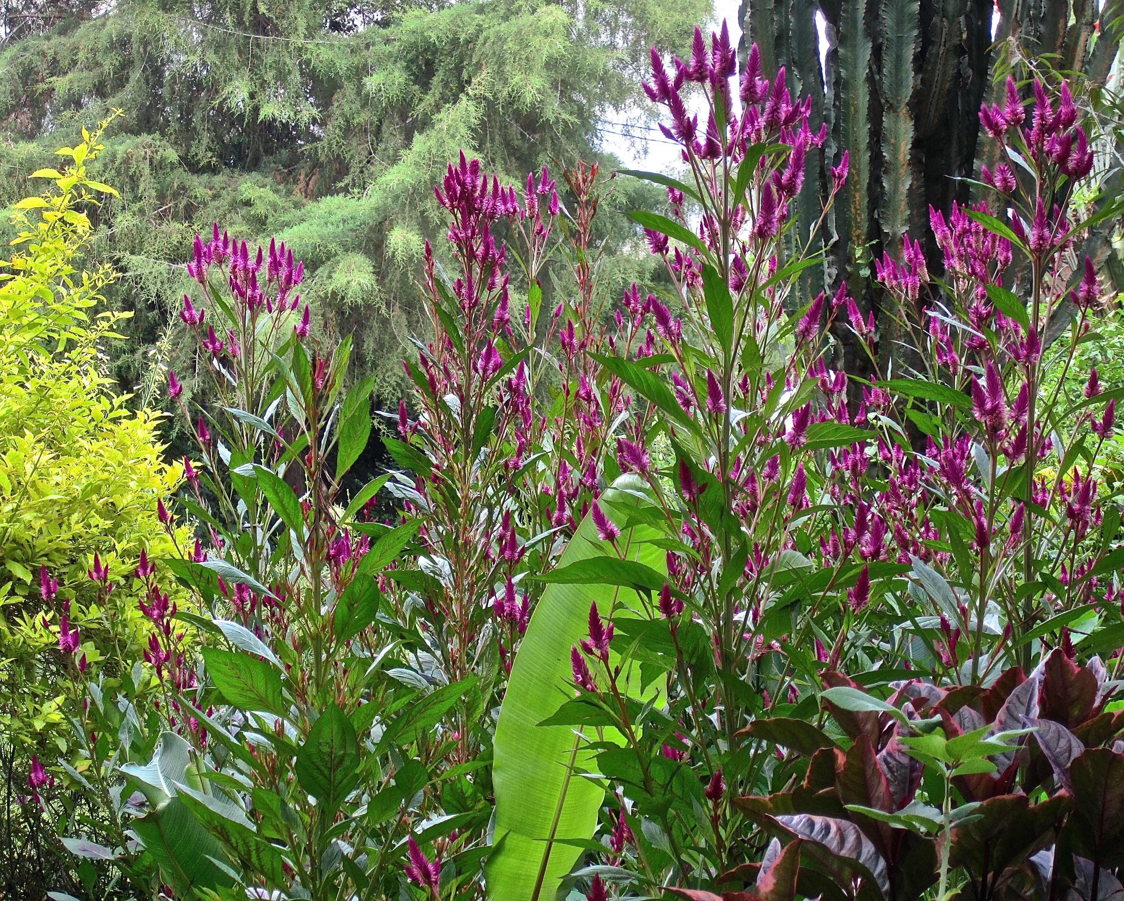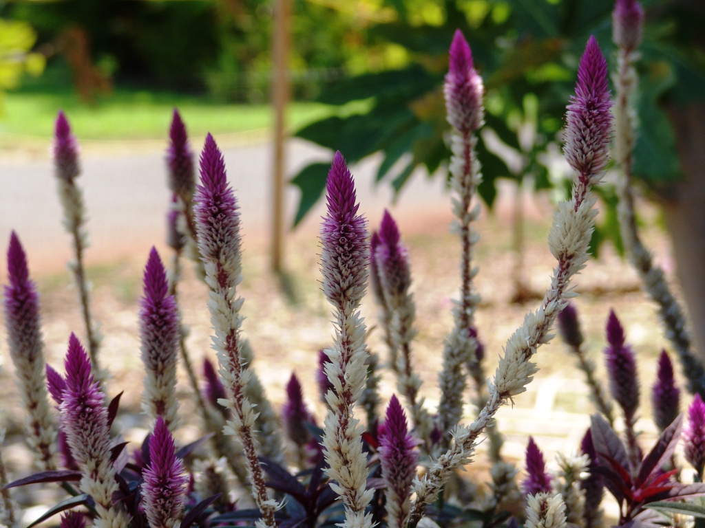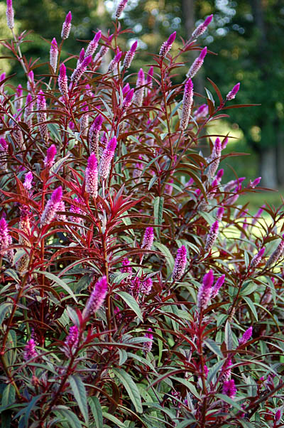 עונתי. פריחה נאה וארוכה בצבעים סגול/ורוד/לבן, השיבולים מתפתלות בסתיו כמו צוואר פלמינגו