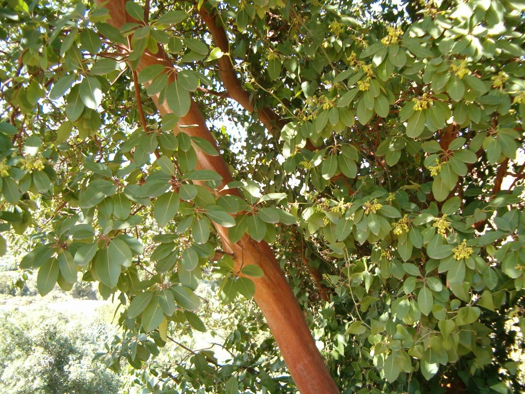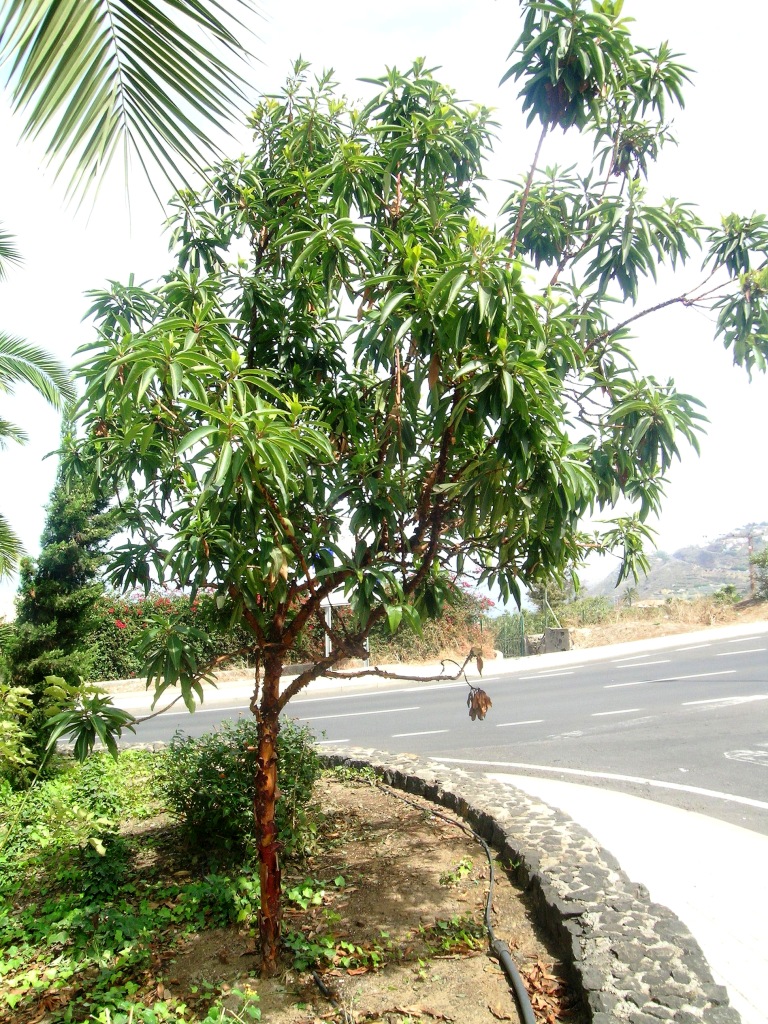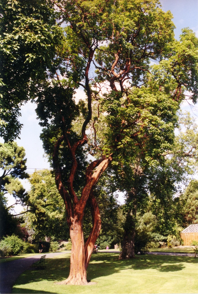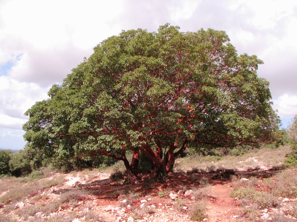 גזע חום אדמדם חלק מאוד דקורטיבי, פרי אדום אכיל, פריחה לבנה נאה